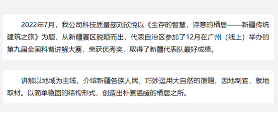全國科普講解大賽是我國范圍最大、水平最高、代表性最強、最具權威性的科普講解比賽,至今已成功舉辦9屆。新疆建筑設計研究院有限公司,作為新疆城鄉建設發展的主力軍,這是第一次參加此類比賽。今后將繼續以科普推廣的實際行動,展現建筑設計工作者的責任與擔當,共同建設團結和諧、繁榮富裕、文明進步、安居樂業、生態良好的美好新疆。