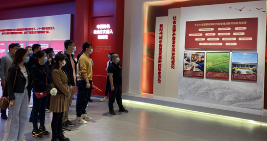 ?在文化中心工作人員帶領下,大家依次參觀了習近平新時代中國特色社會主義思想——”陽光照耀天山”主題展、弘揚偉大建黨精神——”追尋遠去的影像記憶”主題攝影展和鑄牢中華民族共同體意識——36位設計師展示的新疆文化形象特展,認真聆聽現(xiàn)場講解。